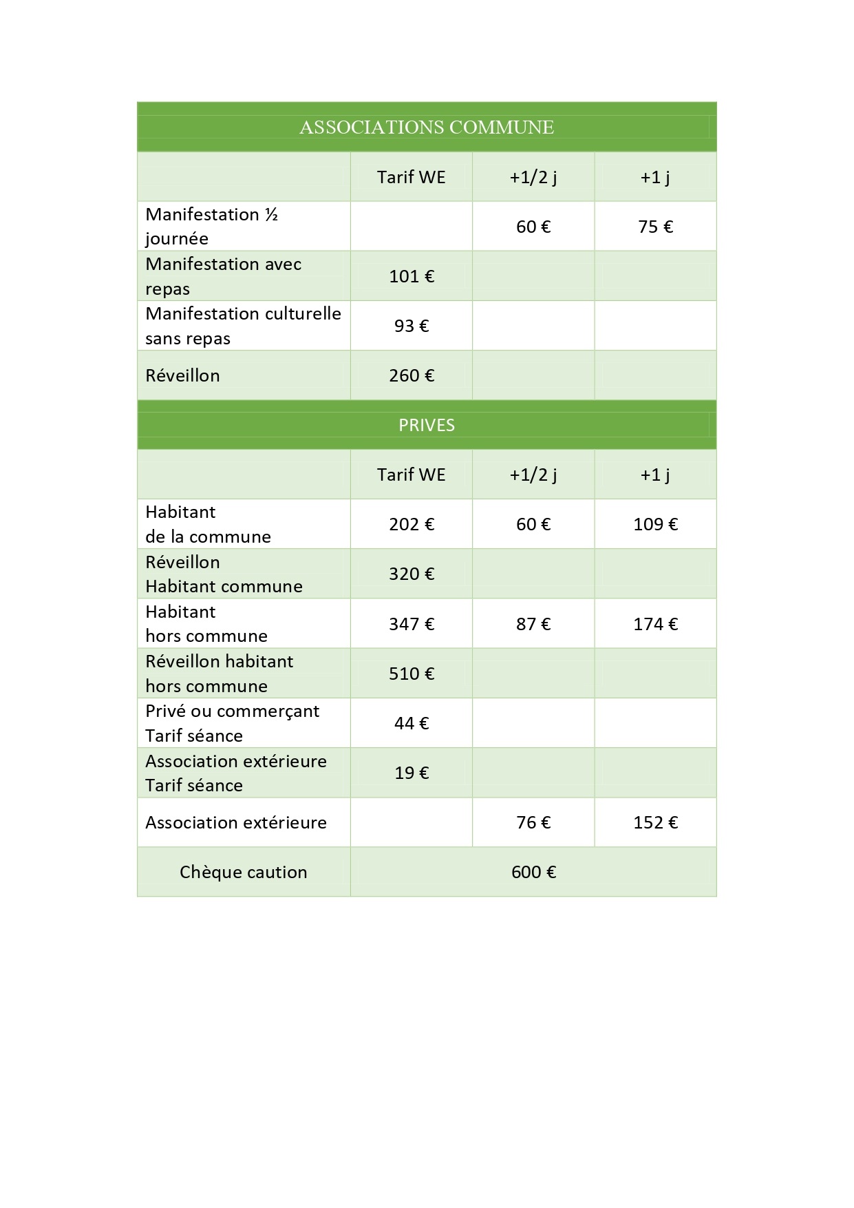 Prévoir la location de la vaisselle en plus( s'adresser à la mairie). Un chèque de caution de 600 € sera demandé.