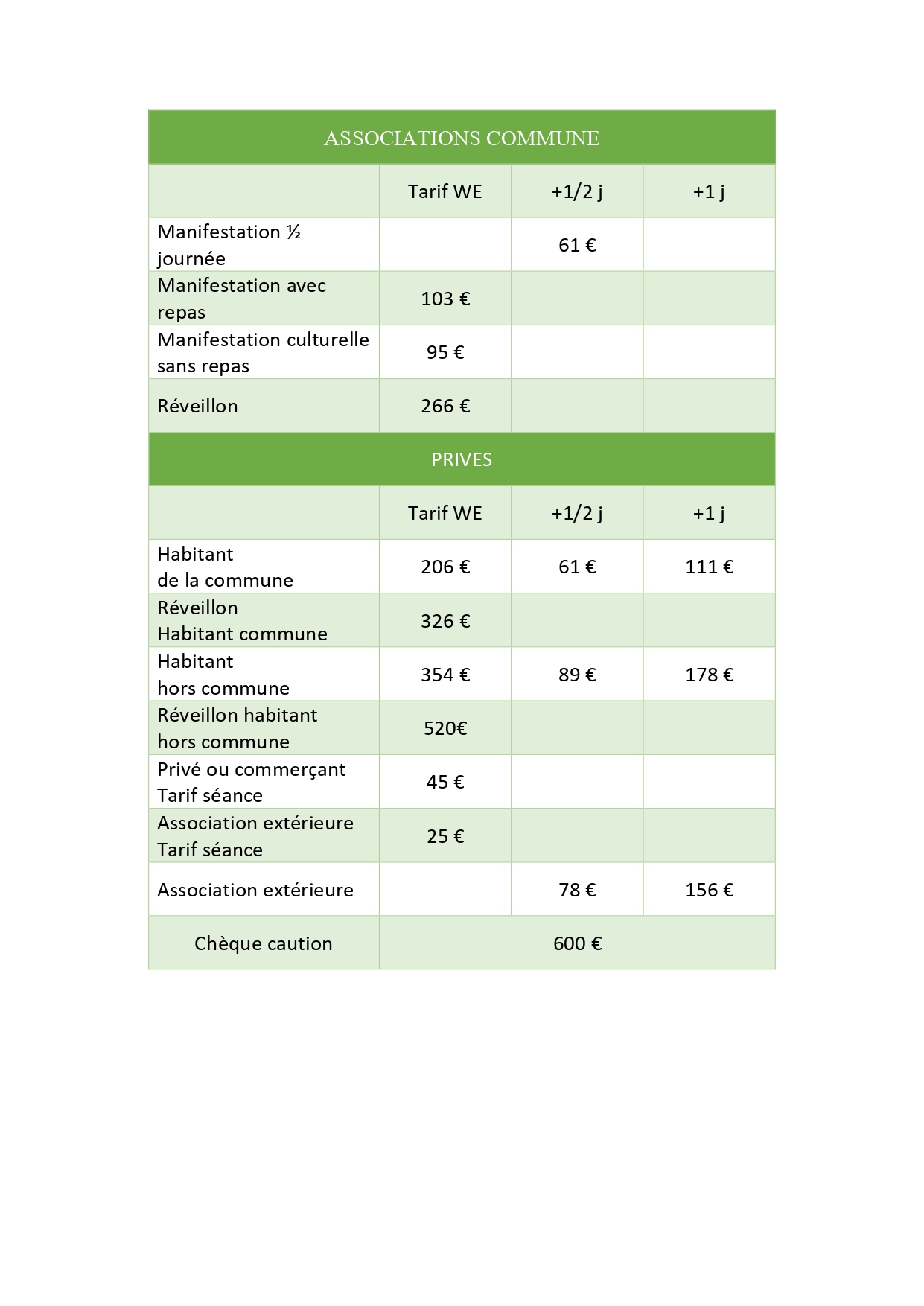 Prévoir la location de la vaisselle en plus( s'adresser à la mairie). Un chèque de caution de 600 € sera demandé.
