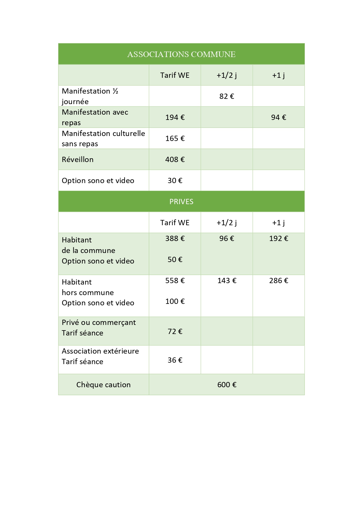 Prévoir la location de la vaisselle en plus (s'adresser à la mairie).